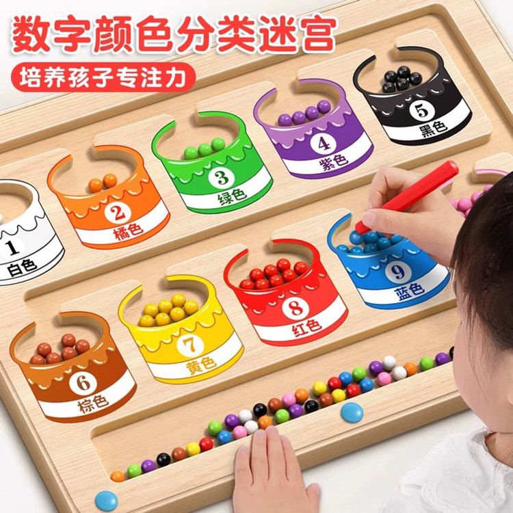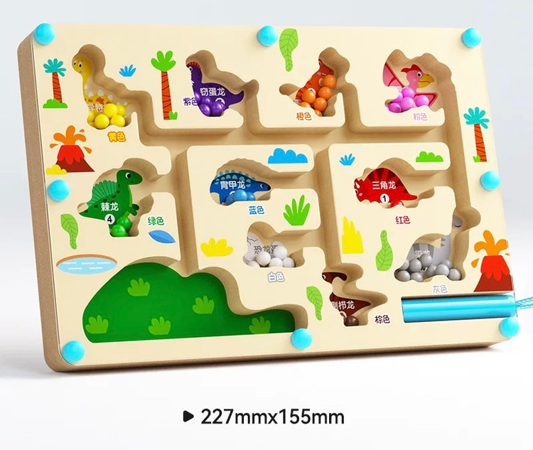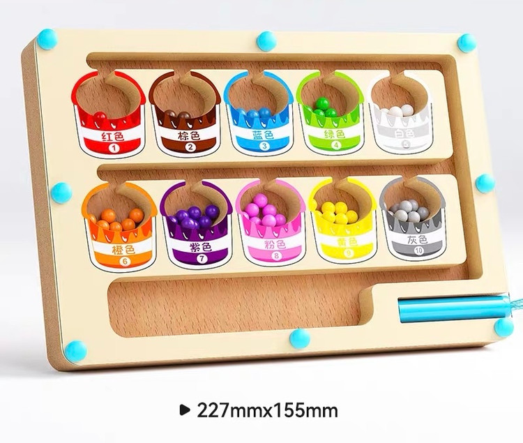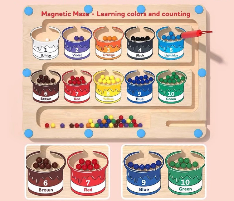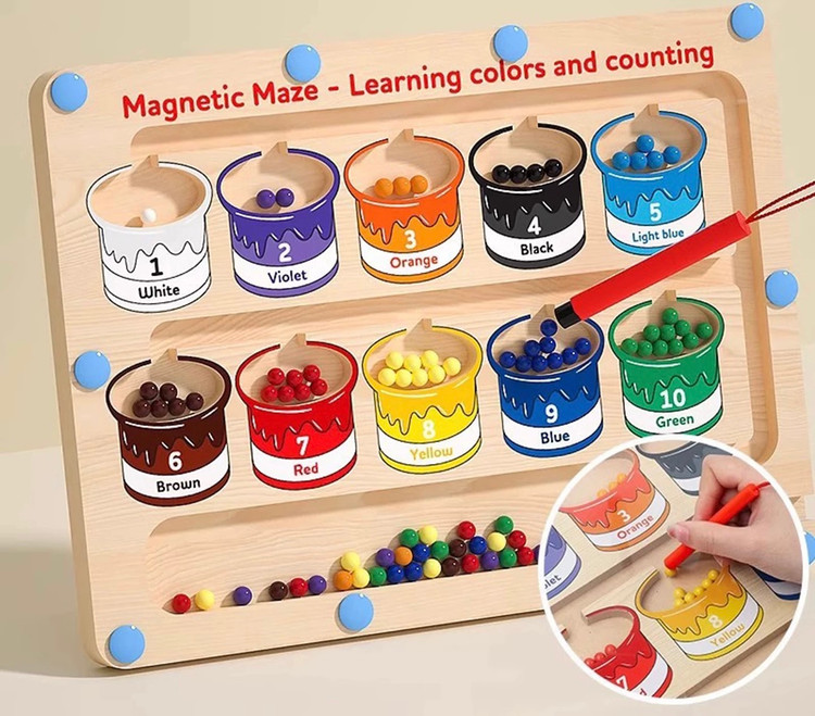 ماز مگنتی یک بورد چوبی مسیردار با مهرههای رنگی و قلم آهنرباییه که کودک باید مهرهها رو از داخل مسیرهای پیچدرپیچ عبور بده و به خونهی همرنگ خودش برسونه.