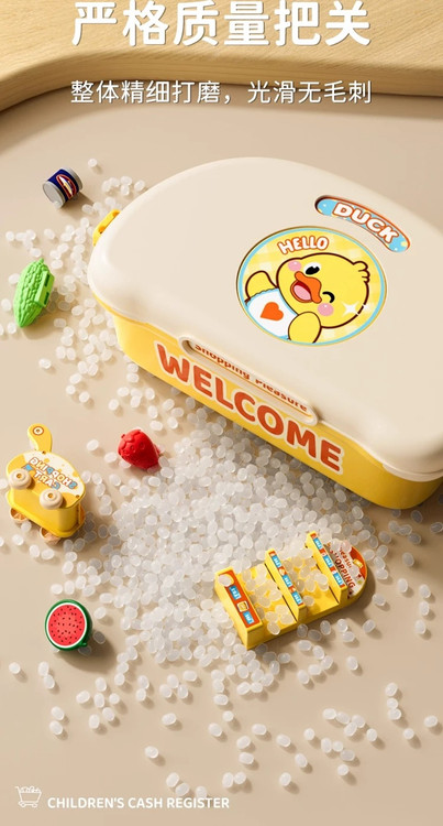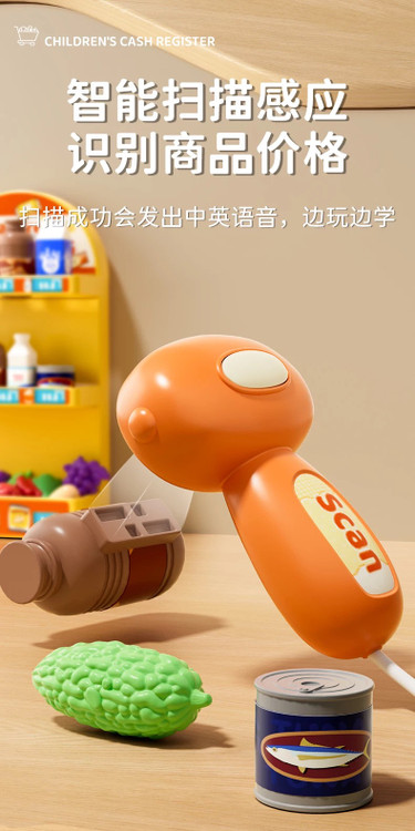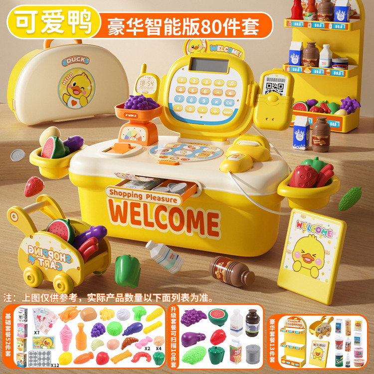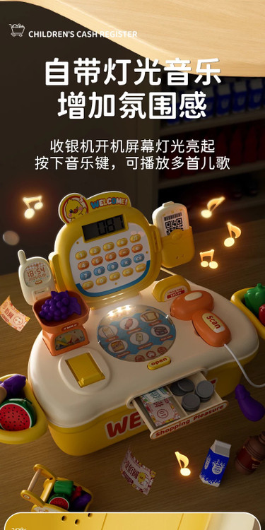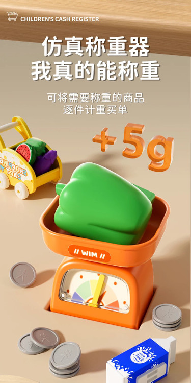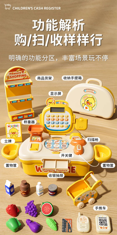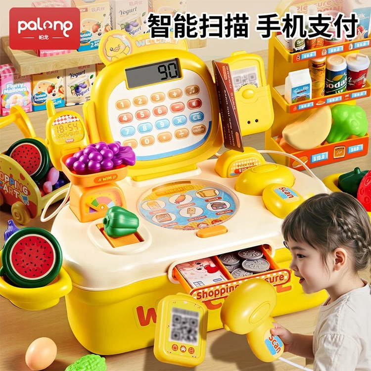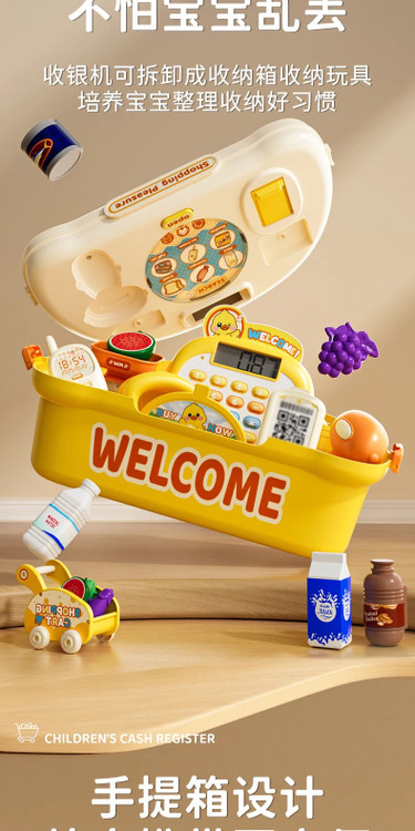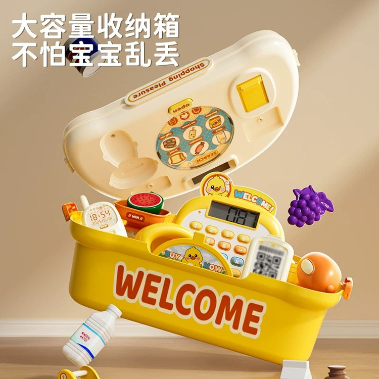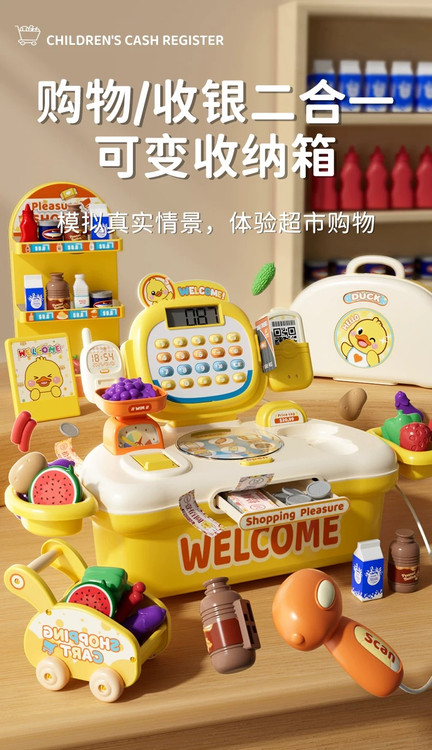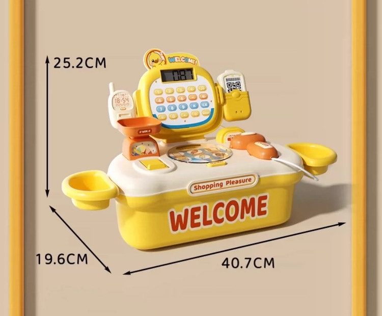 این تصویر مربوط به یک ست صندوق فروشگاهی کودکانه است که برای بازیهای نقشآفرینی طراحی شده. بچهها میتوانند نقش فروشنده یا مشتری را بازی کنند و تجربه خرید از سوپرمارکت را شبیهسازی کنند.