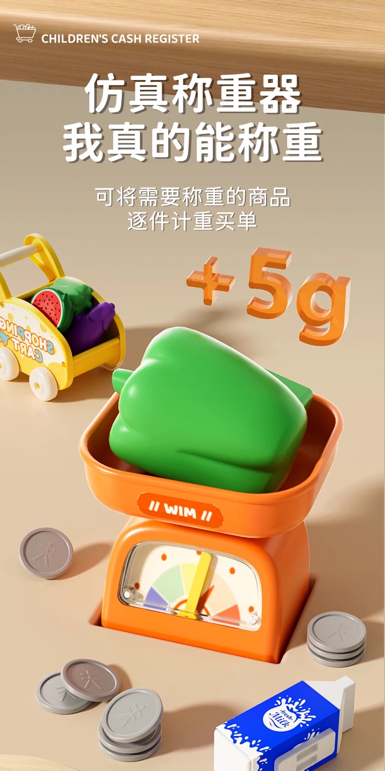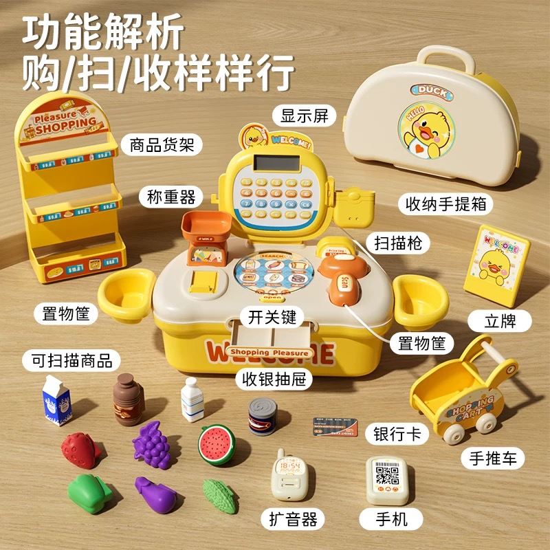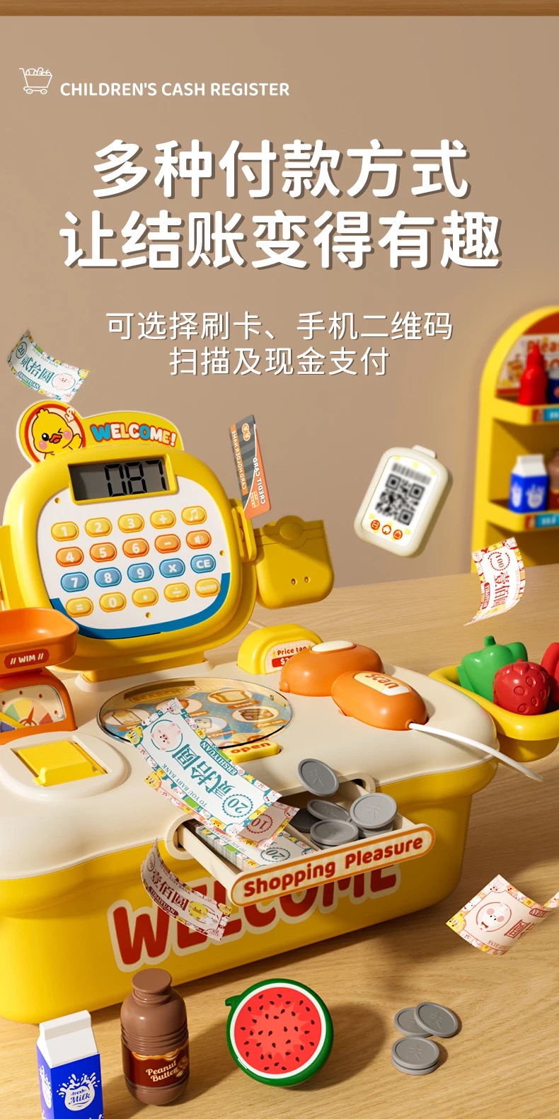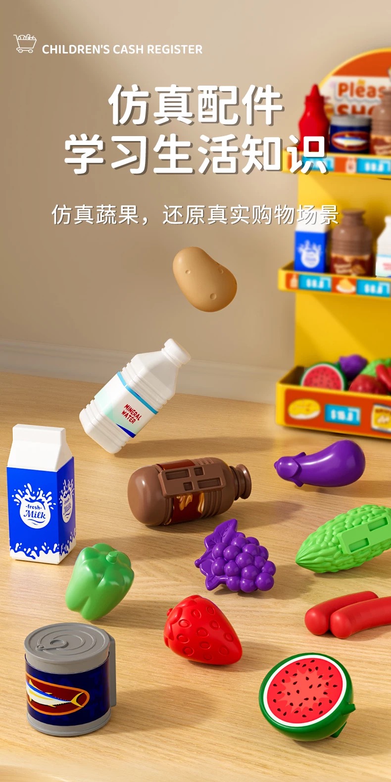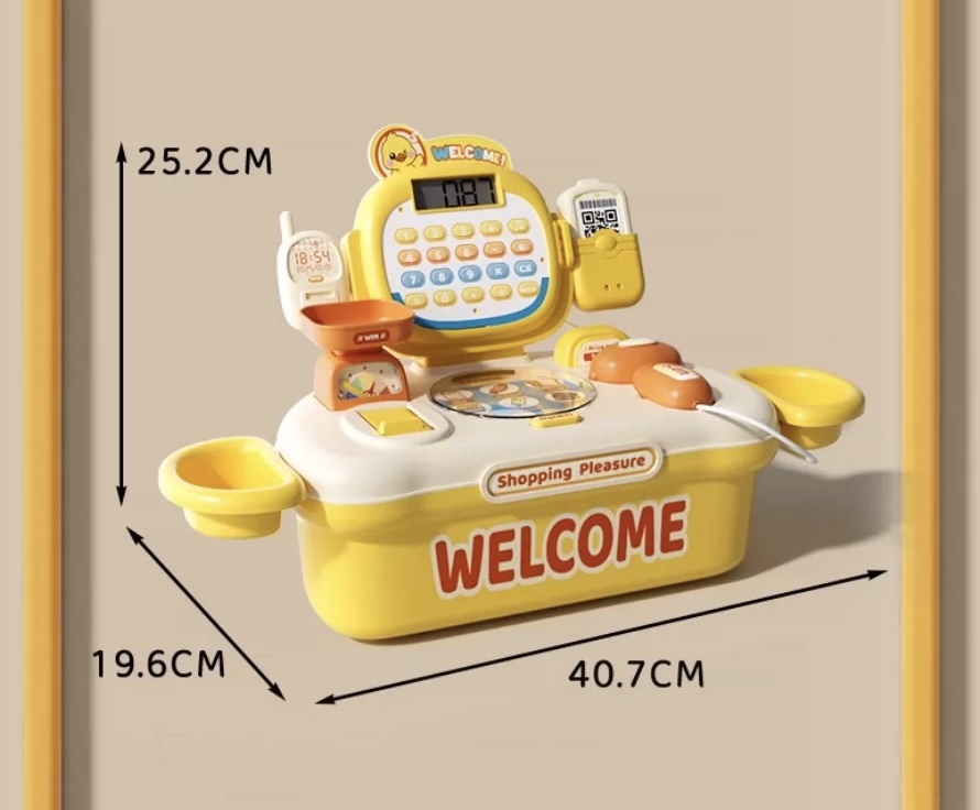 این تصویر مربوط به یک ست صندوق فروشگاهی کودکانه است که برای بازیهای نقشآفرینی طراحی شده. بچهها میتوانند نقش فروشنده یا مشتری را بازی کنند و تجربه خرید از سوپرمارکت را شبیهسازی کنند.