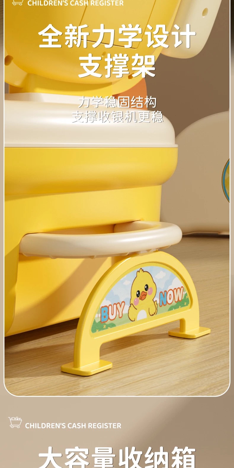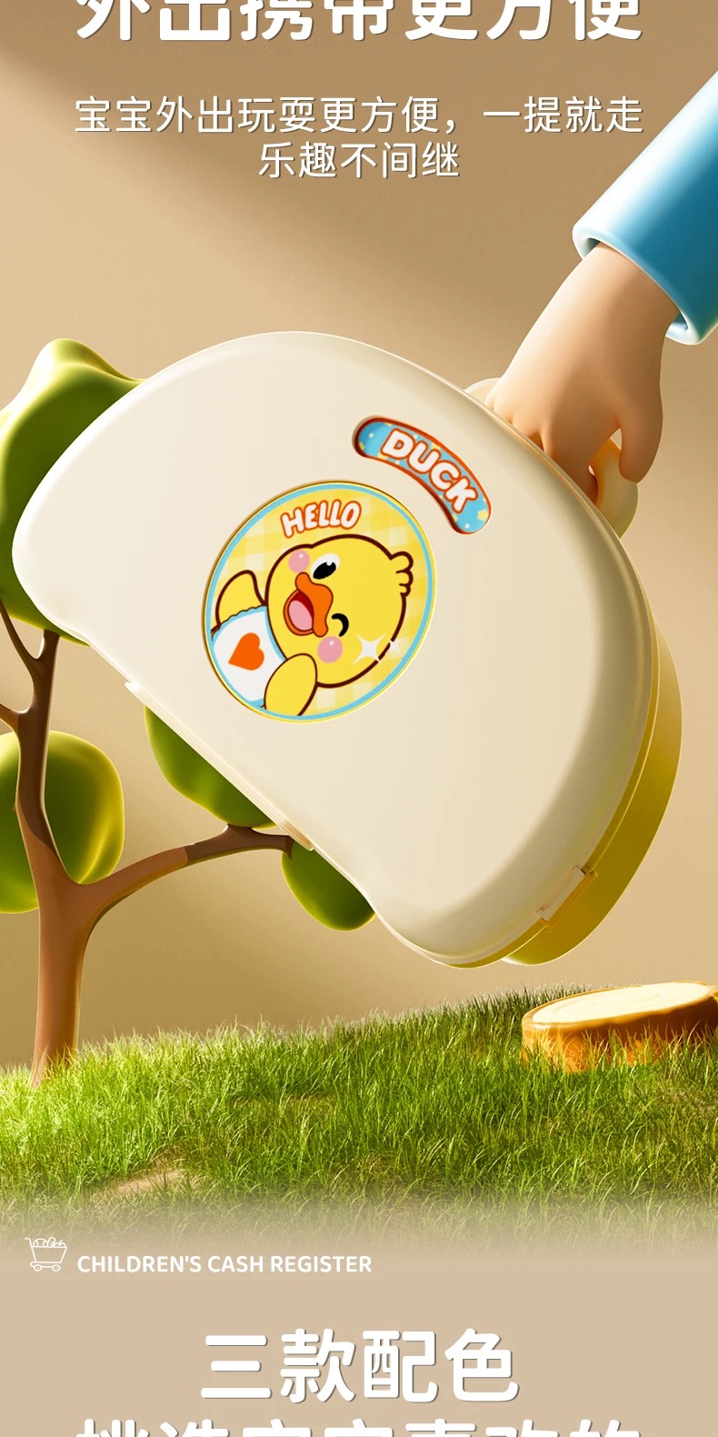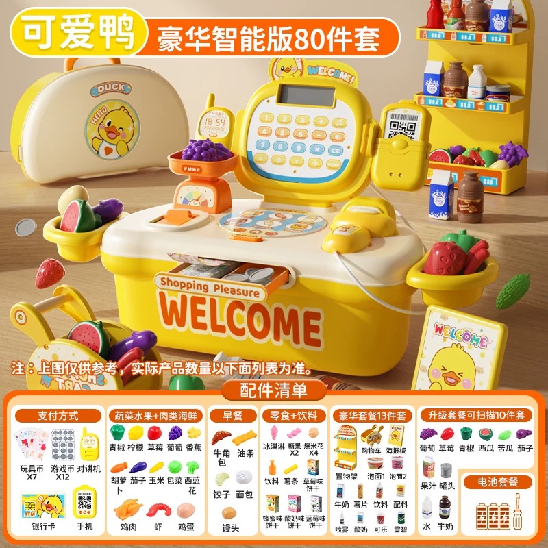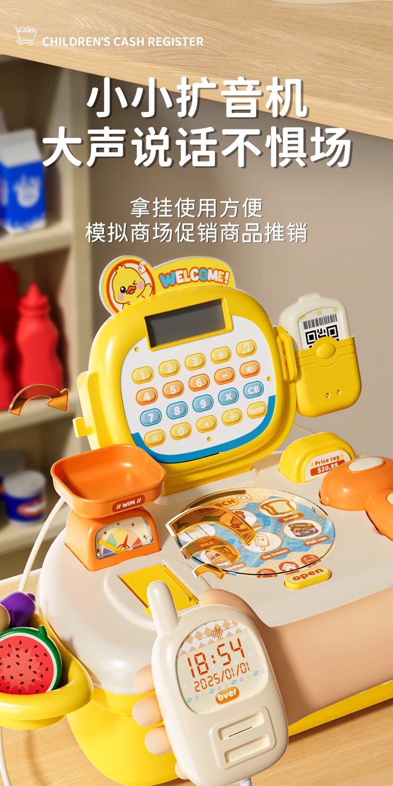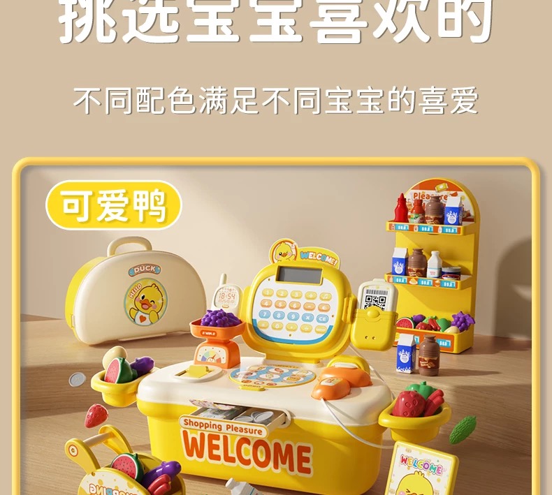 این تصویر مربوط به یک ست صندوق فروشگاهی کودکانه است که برای بازیهای نقشآفرینی طراحی شده. بچهها میتوانند نقش فروشنده یا مشتری را بازی کنند و تجربه خرید از سوپرمارکت را شبیهسازی کنند.