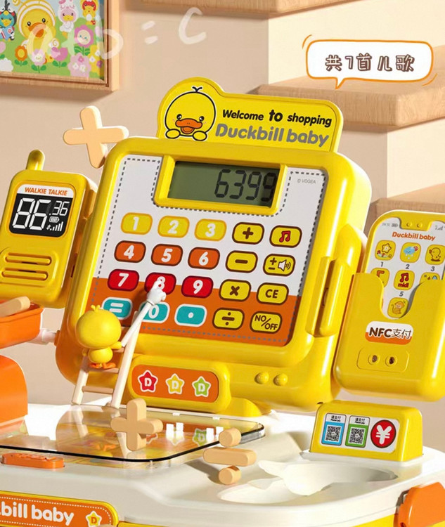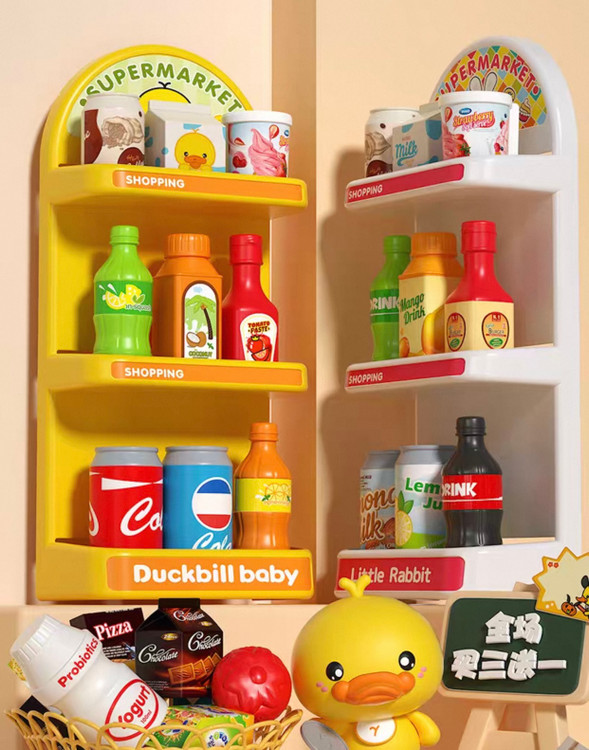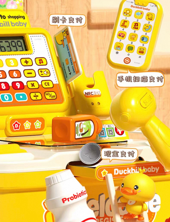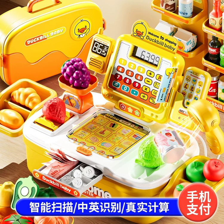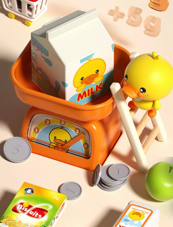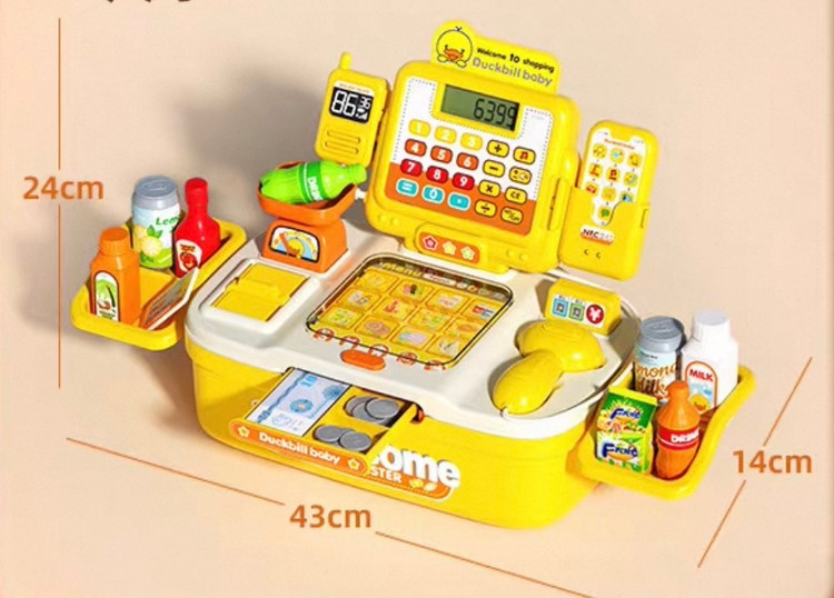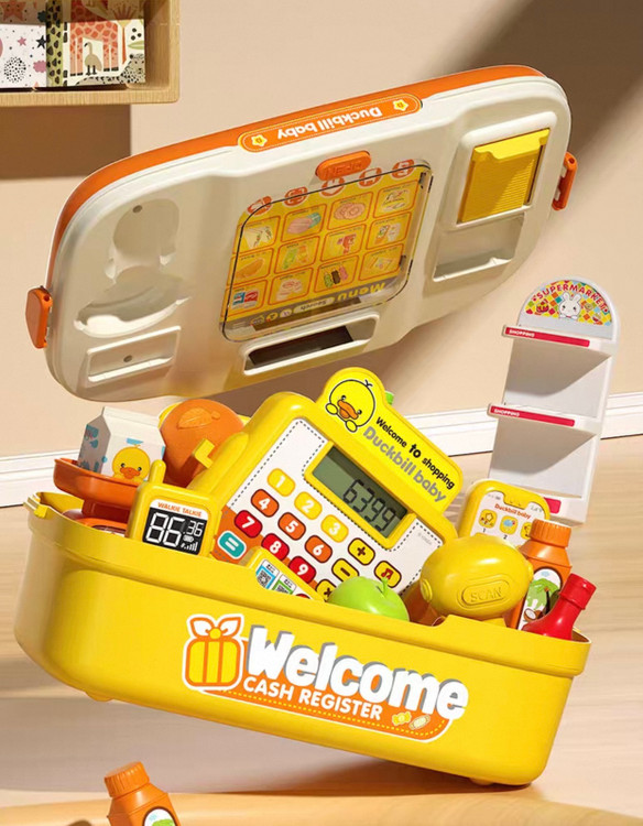 این تصویر مربوط به یک ست صندوق فروشگاهی کودکانه است که برای بازیهای نقشآفرینی طراحی شده. بچهها میتوانند نقش فروشنده یا مشتری را بازی کنند و تجربه خرید از سوپرمارکت را شبیهسازی کنند.