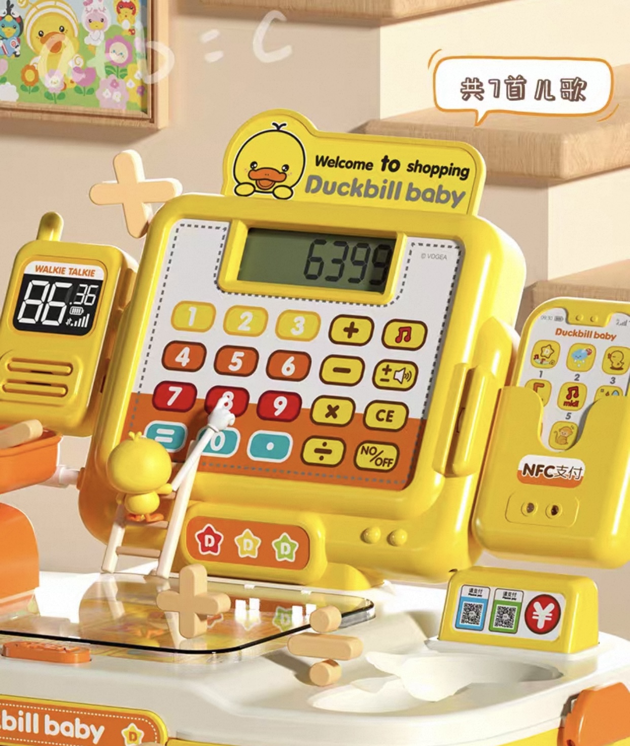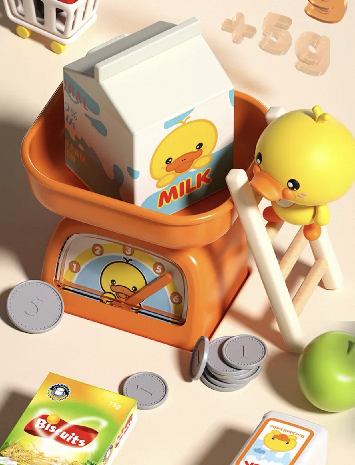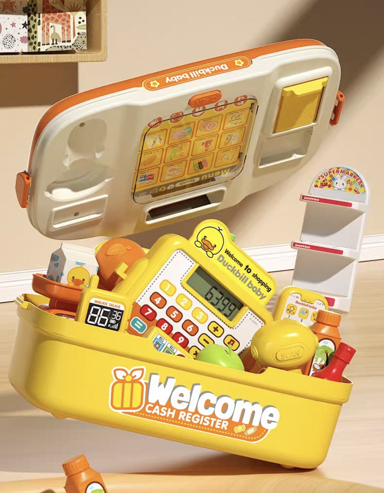 این تصویر مربوط به یک ست صندوق فروشگاهی کودکانه است که برای بازیهای نقشآفرینی طراحی شده. بچهها میتوانند نقش فروشنده یا مشتری را بازی کنند و تجربه خرید از سوپرمارکت را شبیهسازی کنند.
