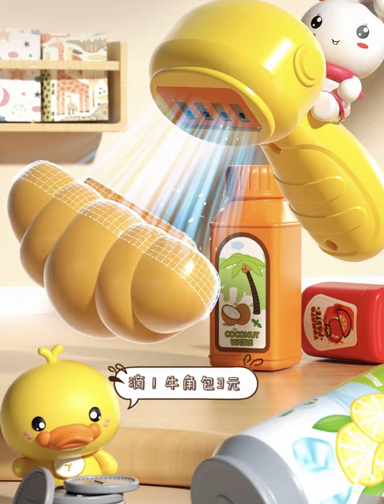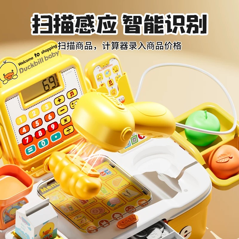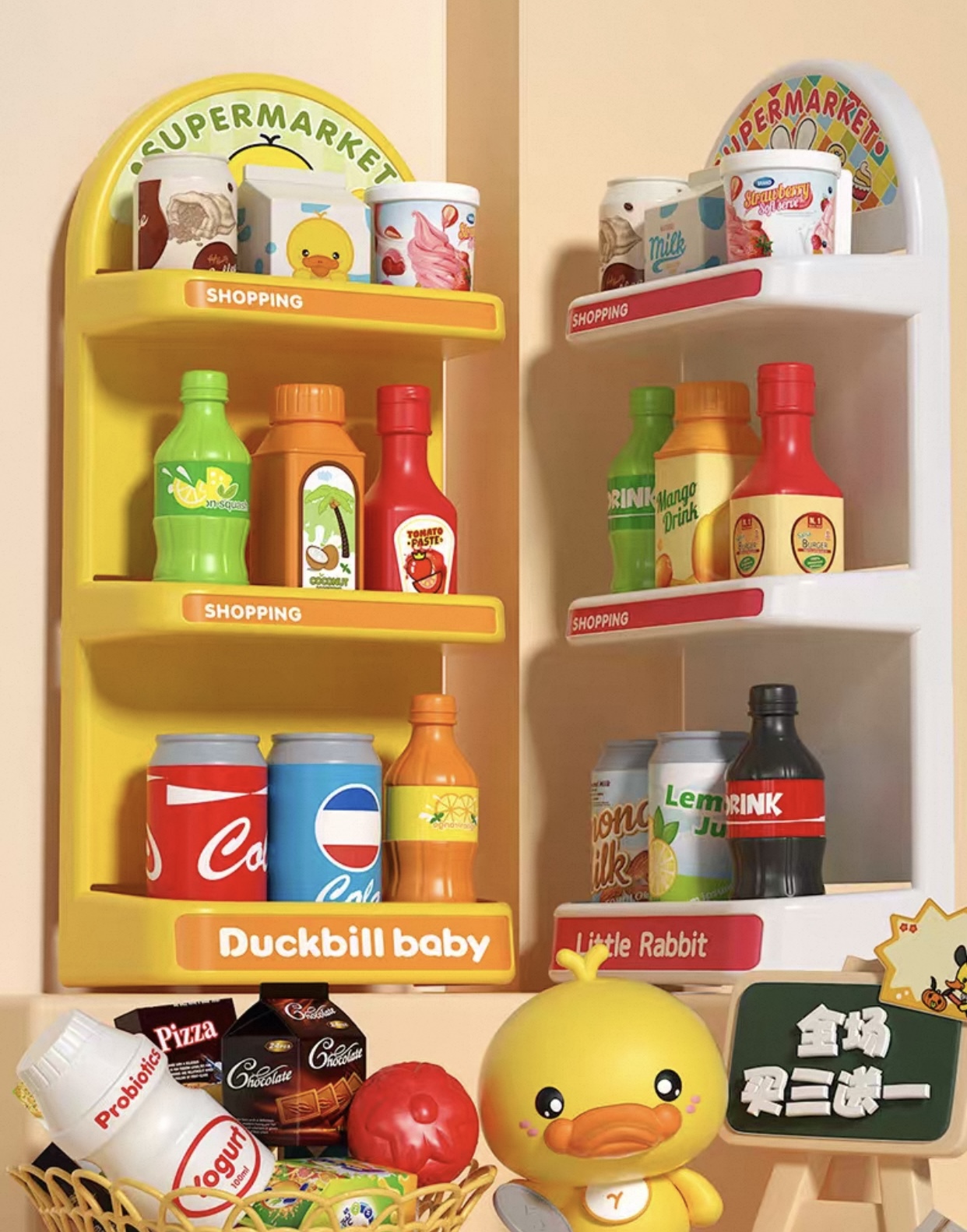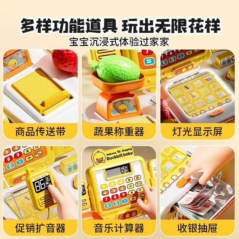 این تصویر مربوط به یک ست صندوق فروشگاهی کودکانه است که برای بازیهای نقشآفرینی طراحی شده. بچهها میتوانند نقش فروشنده یا مشتری را بازی کنند و تجربه خرید از سوپرمارکت را شبیهسازی کنند.